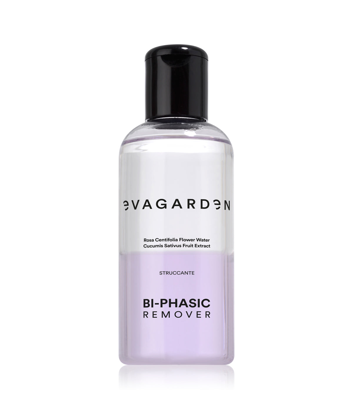 EVAGARDEN two-phase make-up remover to remove waterproof products from eyes and lips. An easy-to-use two-phase formula (oil and water) that eliminates even the most resistant of mascaras such as Mascara Aquaproof EVAGARDEN and the most resistant lip colors such as Ultralasting EVAGARDEN lipstick. Absolutely delicate, suitable for all skin types, with a soothing and refreshing action that respects the delicacy of the eyes and lips.